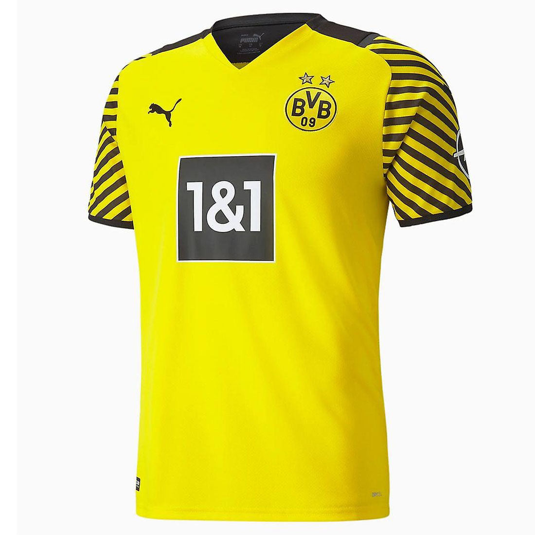 dryCELL: PUMA's designation for moisture-wicking properties that help keep you dry and comfortable Contains Recycled Material: Made with recycled fibers. One of PUMA's answers to reduce our environmental impact V-neck with ribbed construction at back and shell fabric on front / Raglan sleeve construction with mesh shoulder panel Contrasted bonded cuff on both sleeves / Official Borussia Dortmund 09 logo on left chest PUMA Cat Logo on right chest and both sleeves / 100% polyester Short sleeve 100% polyester Genuine PUMA product